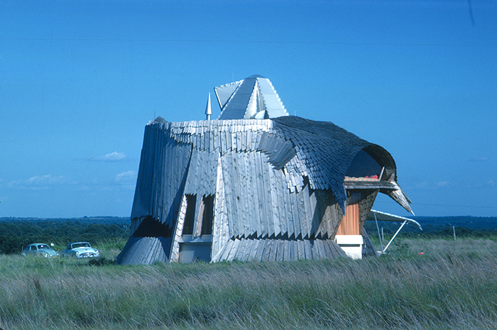 The Prairie House in Norman, Oklahoma, was designed by OU alumnus Herb Greene for his family in 1960-61. Located on the open prairie east of Norman, the house is sheathed in cedar boards and shakes. The wrapping and rising forms give the building an anamorphic presence on the landscape, which earned it the nickname “the Prairie Chicken House.” The cedar shakes continue inside the home, covering nearly every wall and ceiling plane. The effect of this unusual interior treatment is evocative and haunting. Greene’s design was inspired, in part, by his classmate John Hurtig’s drawing series, “A Cathedral for the Religion of Architecture,” as well as by the winds and views of the Oklahoma prairie.